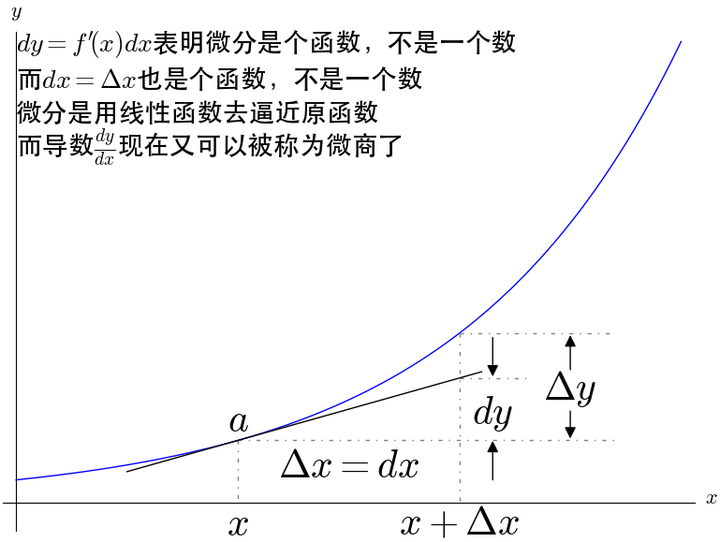 从这张图得出导数的定义 f’(x)=\frac{dy}{dx} ,而 dx 和 dy 被称为 x 和 y 的微分,都为无穷小量,所以导数也被莱布尼兹称为微商(微分之商)。