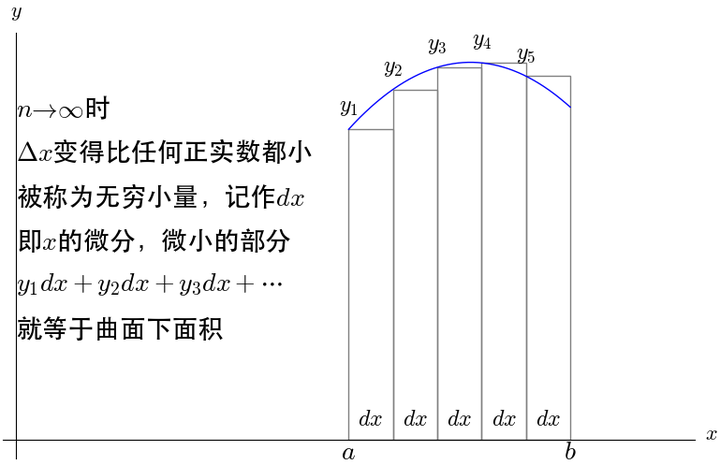 曲线下的面积在微积分出现之前是一个很复杂的问题,微积分求解的主要思想是把曲线下的面积划分成了无数个矩形面积之和: