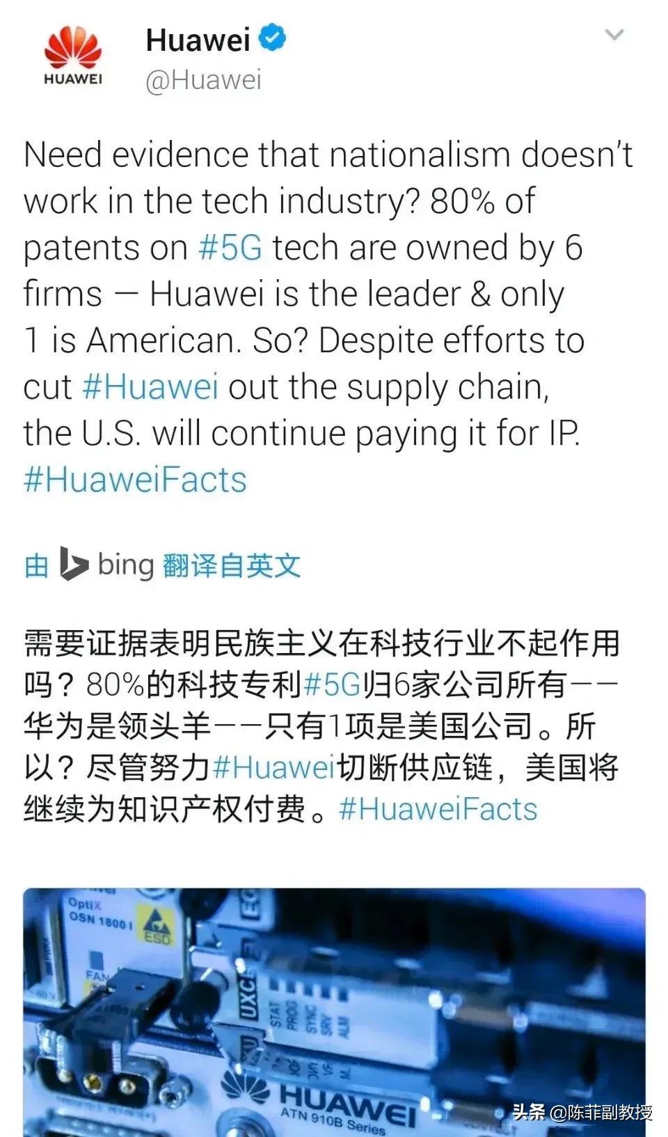 华为官方推特:全世界5G技术80%专利归6家公司拥有,其中华为是领头羊,只有1项是美国公司。所以,尽管努力的切断华为供应链,但美国将继续为华为的知识产权付费!