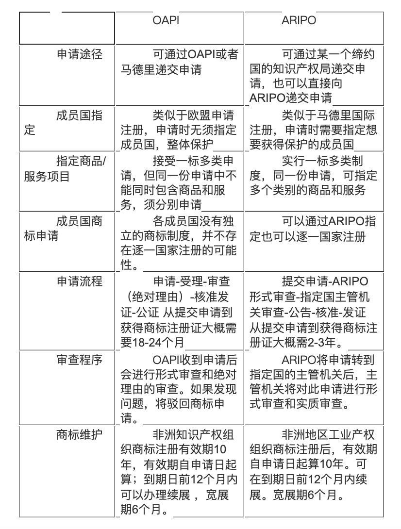 ARIPO专利体系适用于非洲西部、南部等前英属殖民地国家的19个成员国,官方语言为英语,ARIPO申请必须指定在哪些成员国得到保护;OAPI专利体系适用于非洲东部、中部等前法属殖民地国家的17个成员国,官方语言为法语,OAPI无需指定成员国,只要提交一份申请就能在所有成员国得到保护。