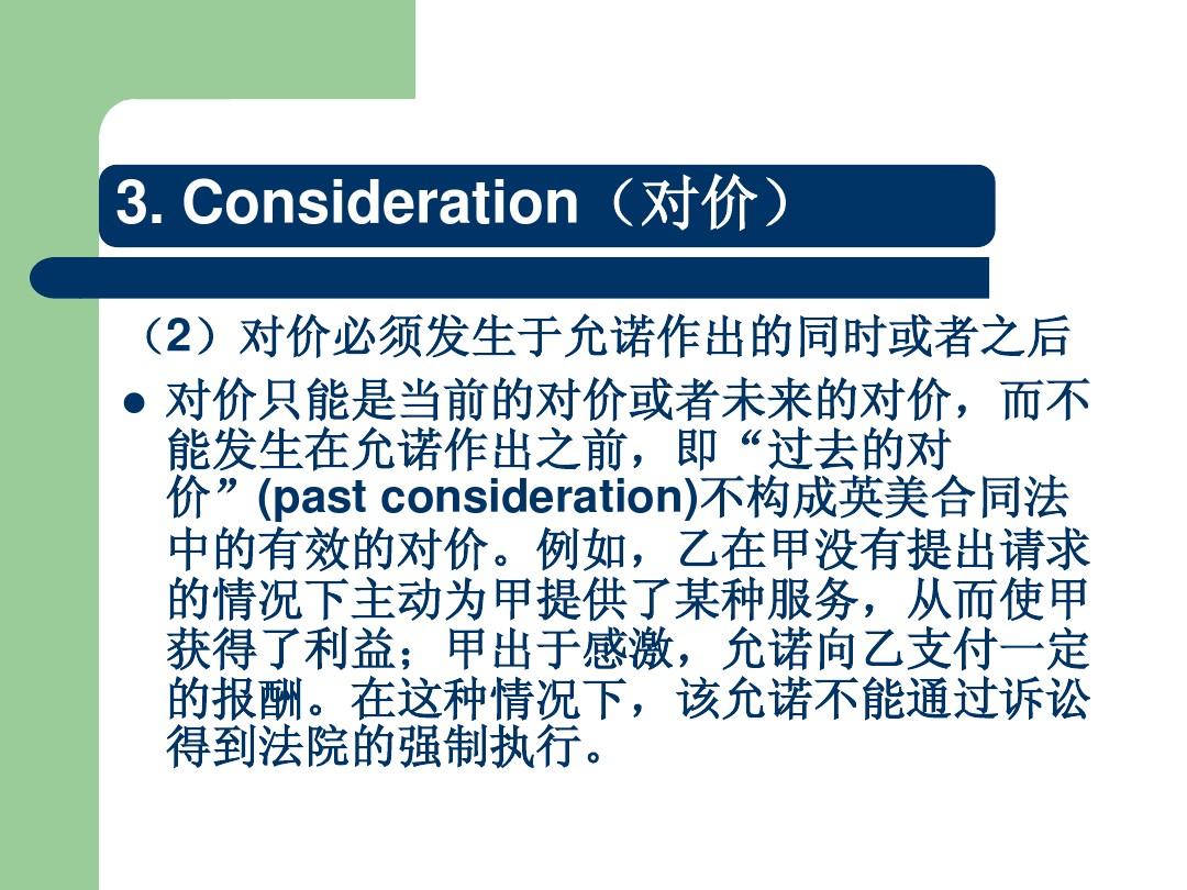 - 对价须是待履行或已履行的对价,过去的对价不能构成有效的对价;