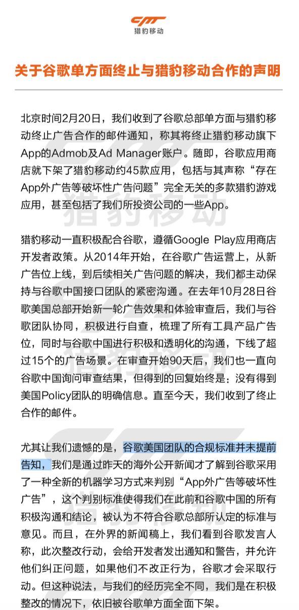 据猎豹移动方面介绍,从在去年10月28日谷歌美国总部开始新一轮广告效果和体验审查后,一直与谷歌团队协同,积极进行自查,梳理了所有工具产品广告位,同时与谷歌中国进行积极和透明化的沟通,下线了超过15个的广告场景。在审查开始90天后,也一直向谷歌中国询问审查结果,但得到的回复始终是:没有得到美国Policy团队的明确信息,直至收到了终止合作的邮件。