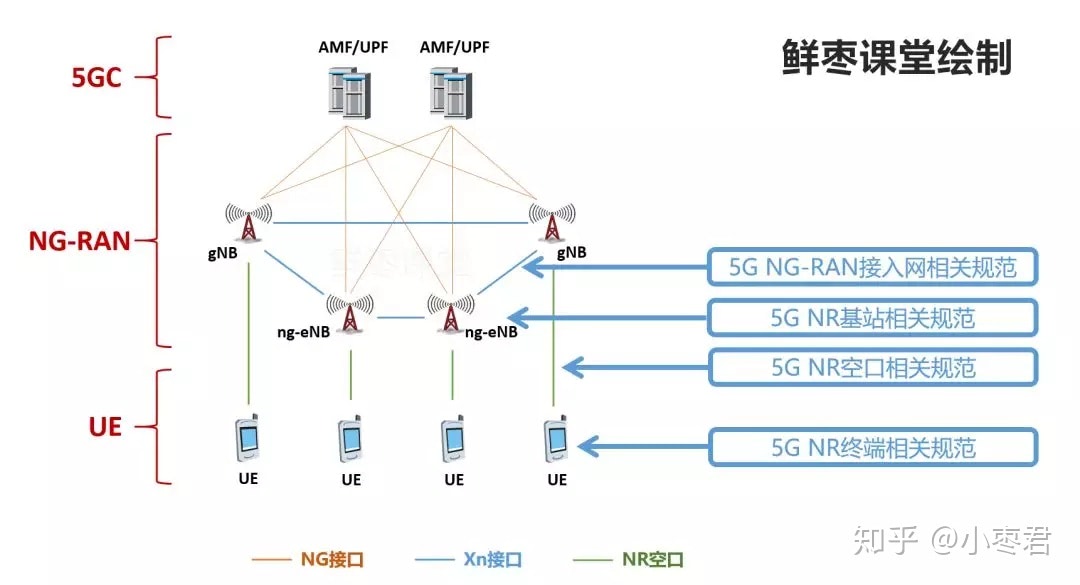 如下图所示,架构分为5G核心网5GC和无线网NG-RAN两大部分。NG和Xn是两大主要接口,前者属于无线网和核心网的接口,后者属于无线网节点之间的接口。