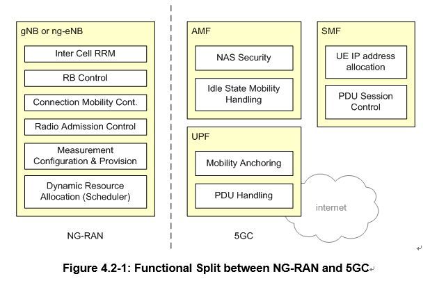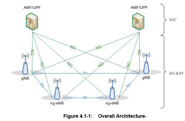 如下图所示,架构分为5G核心网5GC和无线网NG-RAN两大部分。NG和Xn是两大主要接口,前者属于无线网和核心网的接口,后者属于无线网节点之间的接口。