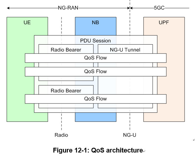 第12章为QoS的描述。下图可以简单描述了从终端-无线接入网-核心网三个层次的QoS FLOW示意图。
