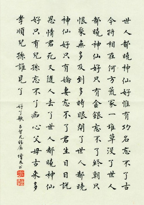 世人都晓神仙好,惟有功名忘不了!古今将相在何方?荒冢一堆草没了。 世人都晓神仙好,只有金银忘不了!终朝只恨聚无多,及到多时眼闭了。 世人都晓神仙好,只有姣妻忘不了!君生日日说恩情,君死又随人去了。 世人都晓神仙好,只有儿孙忘不了!痴心父母古来多,孝顺儿孙谁见了?