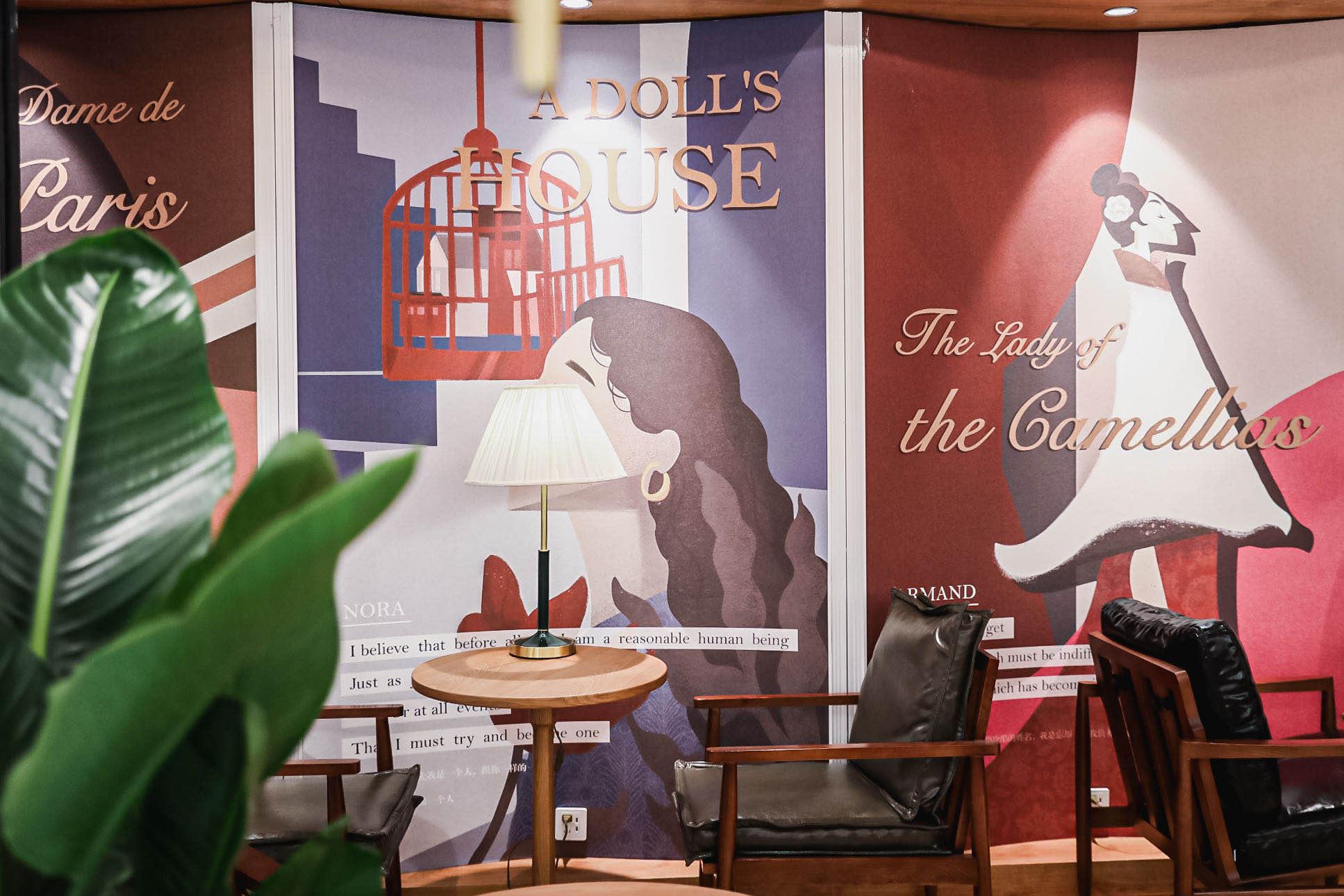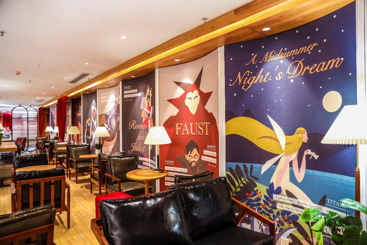 就连书店咖啡区,也有一整面的墙画海报带读者重温11部经典戏剧场景——“哈姆雷特”身处那场孤独的复仇;属于夏洛克的“一磅肉”的判决,正经历惊人逆转;还有浮士德在犹豫是否该与魔鬼做交易……