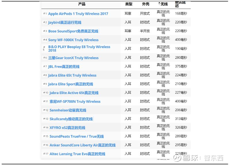 苹果 AirPods 的蓝牙连接稳定、开盖即连体验好,第一代 AirPods 延迟168ms,第二代游戏延迟降低 30%。在 rtings 测试的 37 款 TWS 耳机中,AirPods 的延迟最低。