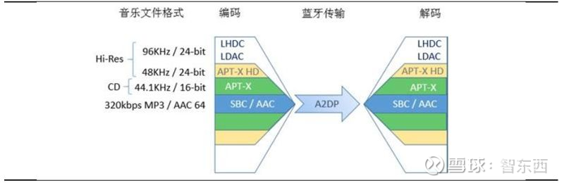 音质的改善在于编码方式。CD 音质需要带宽为 1.41Mbit/s,受限于A2DP 的传输能力,音频数据需要经过编码压缩后再通过 A2DP 传输,所以音频通过蓝牙传输是无法做到百分百还原的,而先进压缩技术可以提升音质。目前比较流行的高品质蓝牙音频压缩算法有 aptX/aptX-HD、LDAC、LHDC等。其中 aptX 为 CSR 公司推行的技术,CSR 被高通收购后成为了高通芯片的专有技术;LDAC 来自索尼,品质非常高,已成为了安卓 8.0 的标配压缩技术;LHDC(HWA)来自华为,规格和 LDAC 相似,也属于无损级别的蓝牙音频编码。