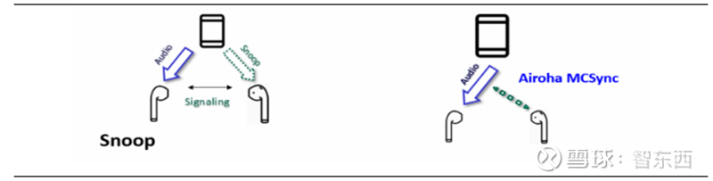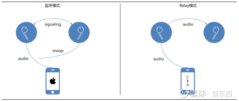 苹果 AirPods 采用 Snoop 监听模式,即左右耳一起听,苹果对监听模式实现了专利封锁。早期其他 TWS 主要采用 relay 转发模式,音频从手机传到左耳(主设备),再由左耳转发到右耳(从设备)。