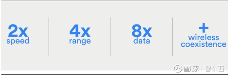 蓝牙 5.0 其实早在 2016 年就已经推出,在 BLE 低功耗模式下具备更快更远的传输能力,传输速率是蓝牙 4.2 的两倍(速度上限为 2Mbps),有效传输距离是蓝牙 4.2 的四倍(理论上可达 300 米),数据包容量是蓝牙4.2 的八倍。蓝牙 5.0 还支持室内定位导航功能,结合 WiFi 可以实现精度小于 1 米的室内定位。