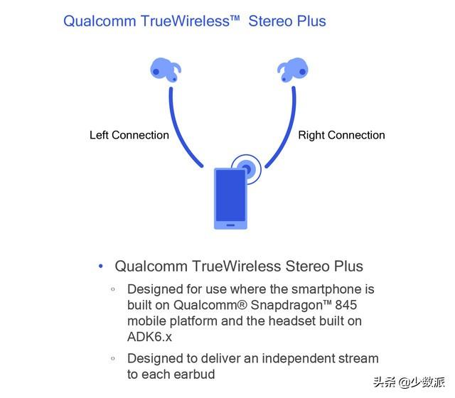 无论是经典方案还是监听方案,实际上都存在一个连接主副耳机的概念,换言之都必须使用主耳机来实现所有立体声数据的接收,而稳定性以及可靠性则取决于单侧耳机单元是否需要处理全部的音频数据。而作为行业领头的高通则在 2018 年拿出了针对 True Wireless Stereo 的增强方案 ——TrueWireless Stereo Plus 作为其新一代蓝牙 Soc 解决方案的一部分。