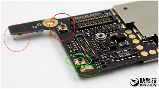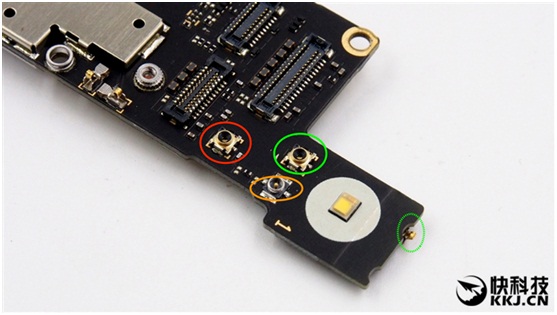 图四是主板PCB顶端,这里有两个switchconnector(红绿实线圈),但是只有一个弹片(绿色虚线圈),另外有一个射频同轴电缆连接器(橙色实线圈)。按照走线方向看,绿色switch connector应该是与绿色弹片相连,红色switch connector应该是与射频同轴电缆连接起相连。这里也是有两路分开的射频信号。从弹片的方向,可以判断弹片应该是与中框的内壁相接触,此为天线馈点之一。