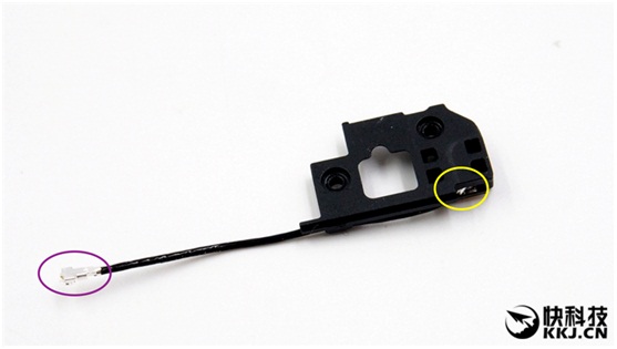下面我们看看另一路信号从同轴电缆连接器开始的路径:如图五所示,同轴射频电缆一端(紫色实线圈)与上图中橙色实线圈所示连接器相连,另一端(黄色实线圈)与小板上的射频同轴连接器相连。