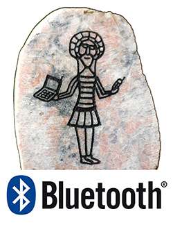 丹麦语的 Blåtand 翻译成英语就是 Bluetooth,因此这位国王又叫哈拉尔蓝牙王(Harald Bluetooth)。关于这个名字的来历有诸多版本,一种传说是因为这位国王很喜欢吃蓝莓,导致牙齿都被染蓝了;也有史学家推测,是国王的某颗牙齿坏死了,在外观上看起来是蓝色的。1996 年,爱立信、诺基亚、东芝、IBM 和英特尔公司计划成立一个行业协会,共同开发一种短距离无线连接技术。开发小组希望这项无线通信技术能像蓝牙王一样,将不同工业领域的工作协调、统一起来。因此,这项技术就命名为蓝牙。而蓝牙的标志正是古代北欧文字 ᚼ和 ᛒ的组合,也就是蓝牙王 Harald Blåtand 的首字母 HB 的合写。借助这个神奇的标志,这位丹麦国王的故事算是真的流芳百世了。