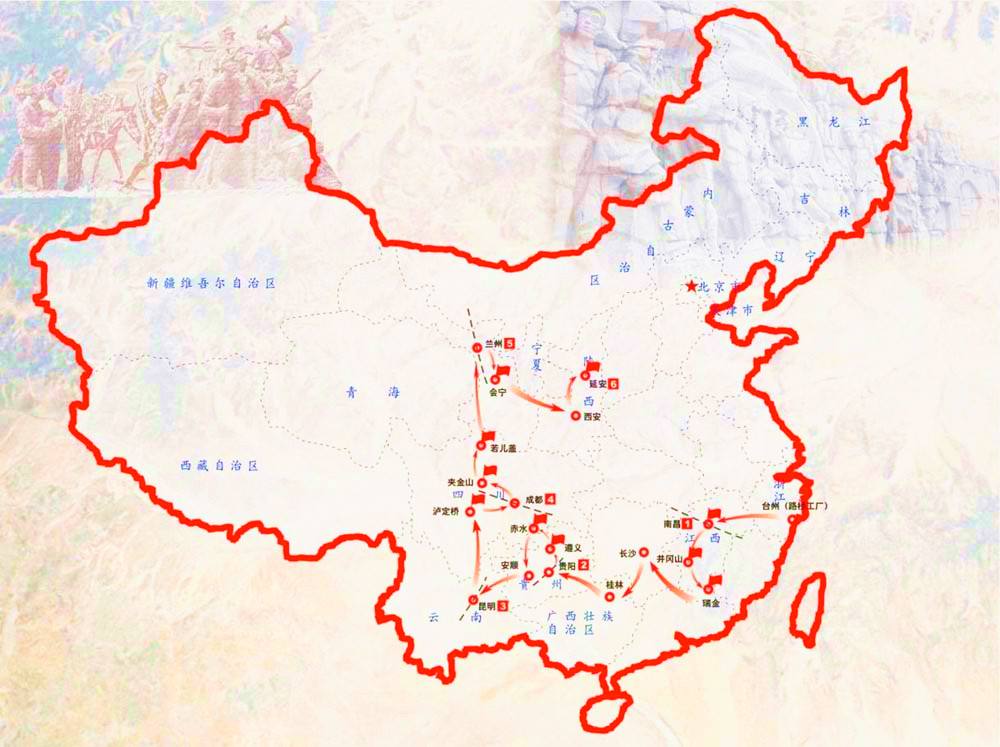 1934年10月,第五次反“围剿”战争失败后,中央红军主力被迫撤离江西革命根据地,准备与二、六军团会合,沿途突破敌人四道封锁线,兵力损失过半。12月,黎平会议后,红军改变会合计划,向贵州腹地进发。1935年1月,红军攻打娄山关,占领遵义城,召开政治局扩大会议,毛泽东在中央的领导地位开始确立。会后,红军四渡赤水、巧渡金沙江、强渡大渡河、翻越夹金山。6月,与红四方面军会合,开始与张国焘的分裂主义作斗争,左路军走过人迹罕至的草地。随后,红一、三军团和军委纵队继续北上,攻克天险腊子口,翻越六盘山,到达吴起镇与陕北红军会师,中央红军长征结束。红军指战员在长征途中表现出了对革命理想和事业无比的忠诚、坚定的信念,表现出了不怕牺牲、敢于胜利的无产阶级乐观主义精神,表现出了顾全大局、严守纪律、亲密团结的高尚品德。这些构成了伟大的长征精神:坚忍不拔,自强不息,勇往直前。