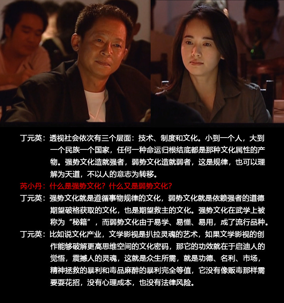 芮小丹针锋相对地说:”强盗的本质是破格获取,破格获取与直接获取是两个不同的概念。你们没有自信与强者在同一个规则下公平竞争,这只能说明你是弱者,因为弱势文化所追求的最高价值就是破格获取。所以,强盗的逻辑从本质上讲是最懦弱的生存哲学。“
